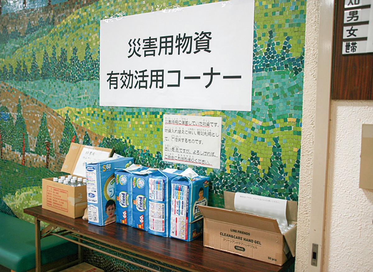 さらに一画に設けられた「災害用物資有効活用コーナー」では、高津区が備蓄している災害用物資のうち、入れ替え作業の際に生じる消費期限が近付いたペットボトル飲料水や紙おむつ、消毒用アルコールスプレー等の無償提供も行っている。