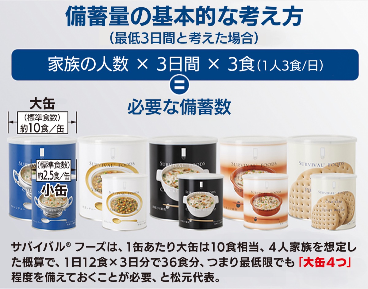 松元代表は「災害が発生してから救助体制が整うまでには3日はかかると言われています。 そのため1人3日分×家族の人数分を最低限、用意しておく必要があります。また子どもの必要量は大人の1/2から2/3を目安に用意して下さい」と説明。また「非常時は不安やストレスで十分に食事をとれない場合がありますので、味のバリエーションなどについても配慮すると、なお良いかと思われます」とも。さらに「被災時に、すぐ取り出せる場所に格納する事も重要。遠方の倉庫では交通マヒで辿り着けなかったり、床下収納では水害時、食べられなくリスクもあります」と注意を呼び掛ける。