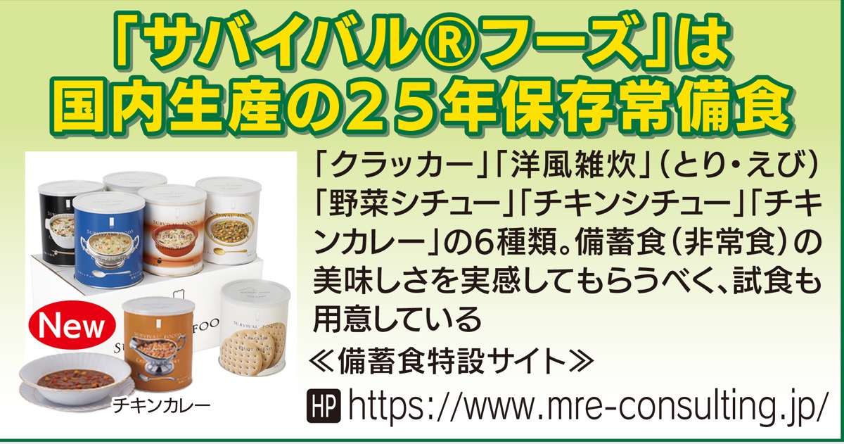 同社では前出の備蓄食「サバイバル®フーズ」をはじめ、各種防災グッズ、ハザードマップやその他資料の提供、さらには建物診断なども行っており、備蓄食については試食も受け付けている。