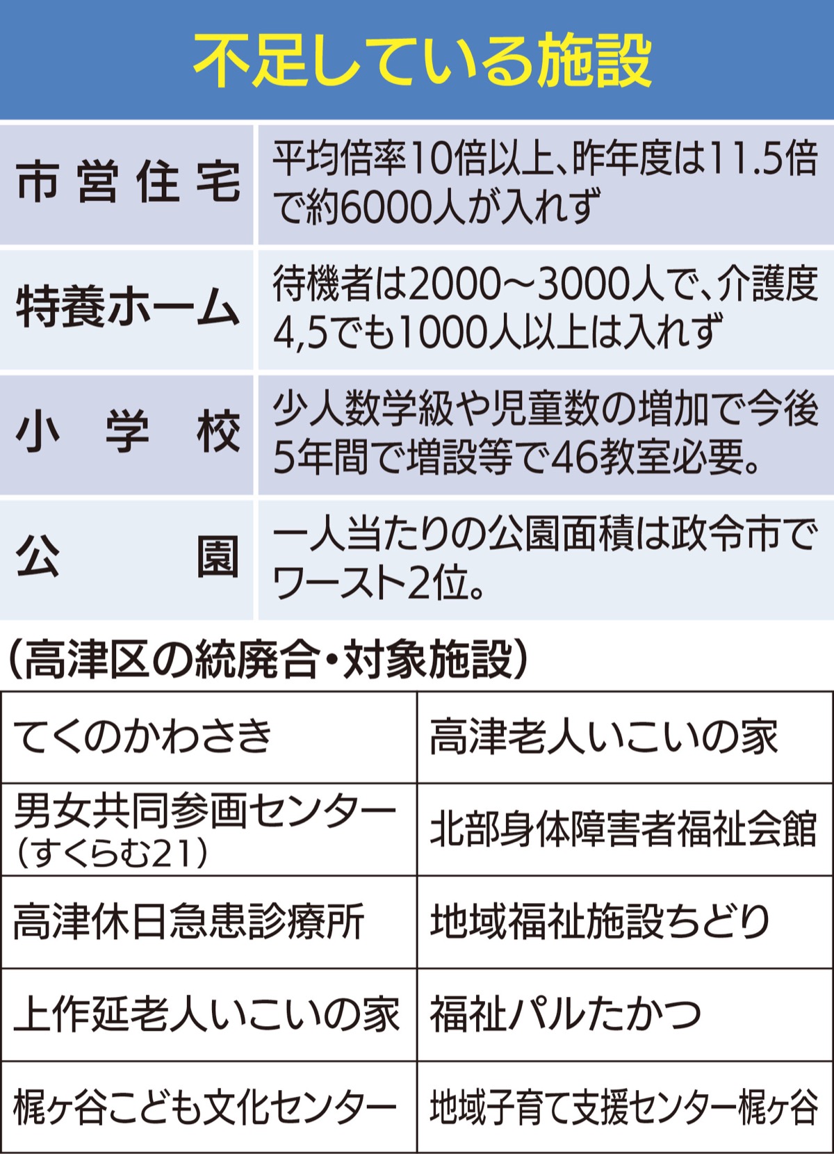 6月の一般質問で、まず、人口推計と「不足している施設」について質問。市営住宅は6000人以上入れない状況、特養ホームは待機者が2000人以上いて、小学校も公園も足りないことを明らかにしました。私は「方針では『施設の床面積は増やさない』としているが、そうなると不足している市営住宅や特養ホームは、これからさらに不足して26年間ずっと不足状態が続くことになる」と指摘し「不足している施設は当然増やすべき」と主張しました。