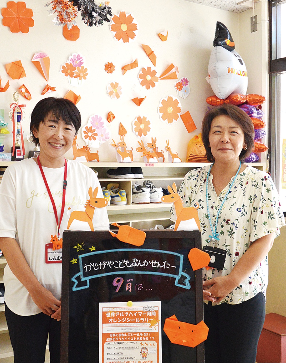 梶ヶ谷こども文化センターでは今月、子どもたちがオレンジ色に染めたバンダナを飾り、館内の壁面もオレンジ色の折り紙で彩った。11日には、認知症キッズサポーター養成講座を実施したほか、9月中は認知症を学ぶスタンプラリー形式の「シールラリー」も行っている。