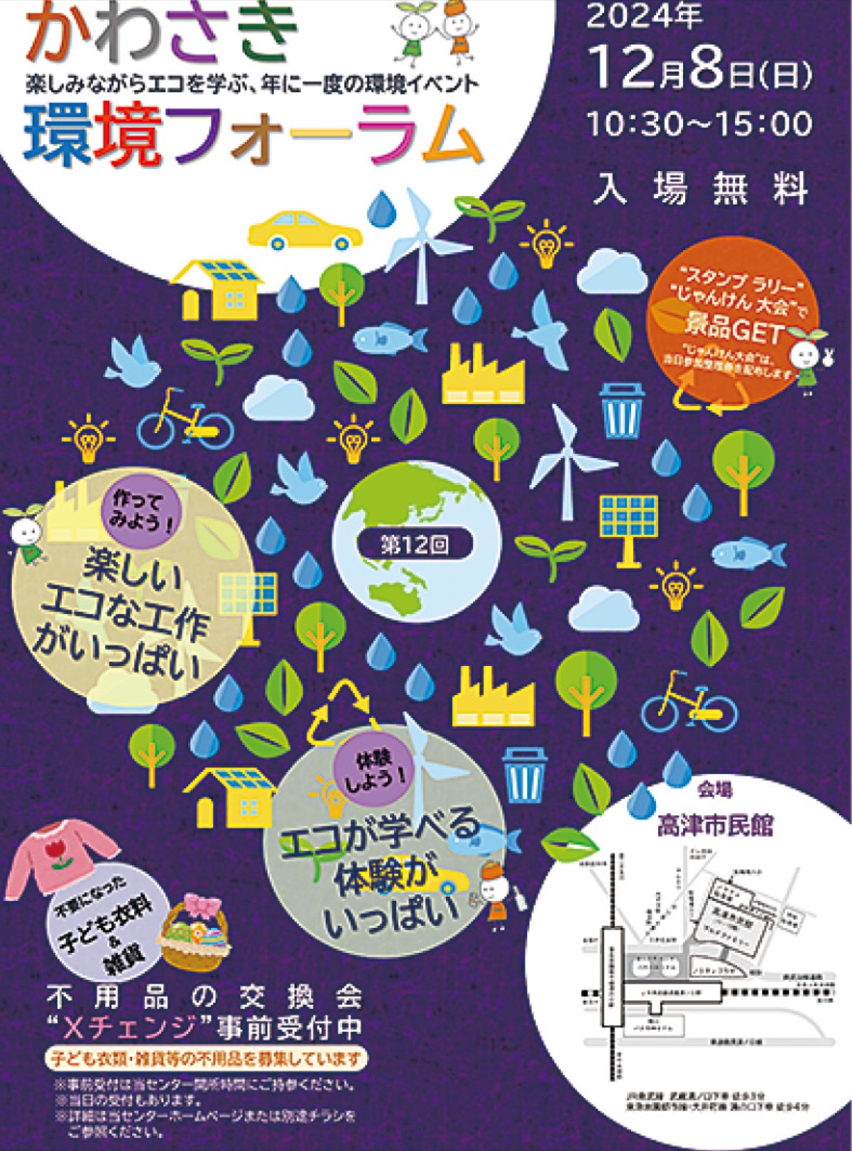 入場無料(一部参加費が必要なブース有)・事前予約不要(先着順)。また、当日は衣類・雑貨等の不用品の交換会”Xチェンジ”も行われる。