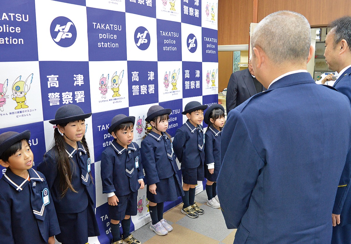 11月23日の「勤労感謝の日」を前に日頃の感謝を伝えようと、久末の川崎めぐみ幼稚園(鈴木健之園長)に通う年長クラス代表の園児6人が高津警察署と高津消防署を22日に訪問した。