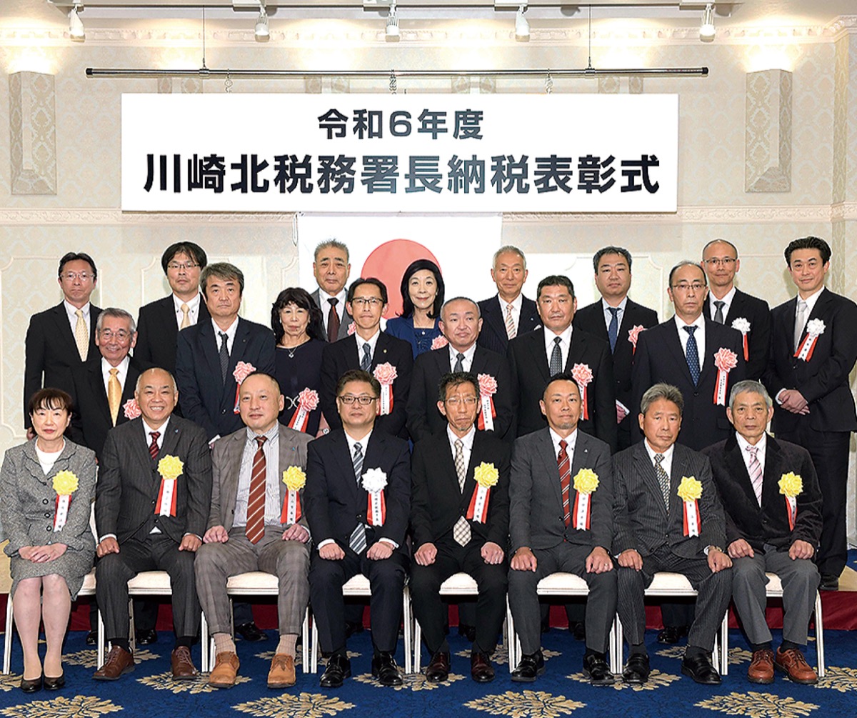 川崎北税務署(荒井寿宏署長)は11月14日、中原区内のホテルで今年度の納税表彰式を開催した。毎年、国税申告や納税等の高揚に貢献のあった人や税務行政の推進に功績のあった人を表彰しており、今年は12人に表彰状や感謝状が贈られた。このほか中学生の税についての作文の表彰もあり、2人が受賞した。