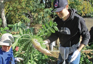 最後がメインの大根抜きです。ゲームの優勝家族に始球式(初大根抜き)を務めてもらって開始です。大人も子供も一人2本抜いてもらい、抜いた大根を持ち帰ってもらいます。今年は青首大根と聖護院大根を育てました。聖護院は栽培数が少ないので1家族で1本までと制限を付けました。京野菜で有名な聖護院、今年は良く出来ていました。自分の頭と同じくらいの大きさの聖護院を抜いた子どももいました。