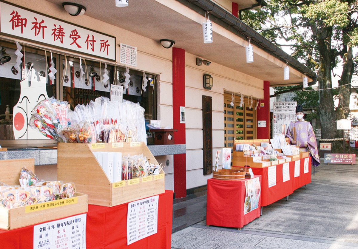 「天照皇太神」を祭る同神社は厄除け、開運、安産、子育て、縁結び、家内安全などにご利益があるとされる。今月下旬からは御祈祷受付所の前に御札や御守り、破魔矢といった縁起ものを領布する一画を新設。また22日には社殿前で厄除けの祈祷「年越えの大祓え」も執り行われるなど、多くの参拝者で賑わう新年を前に、着々と準備が進められている。