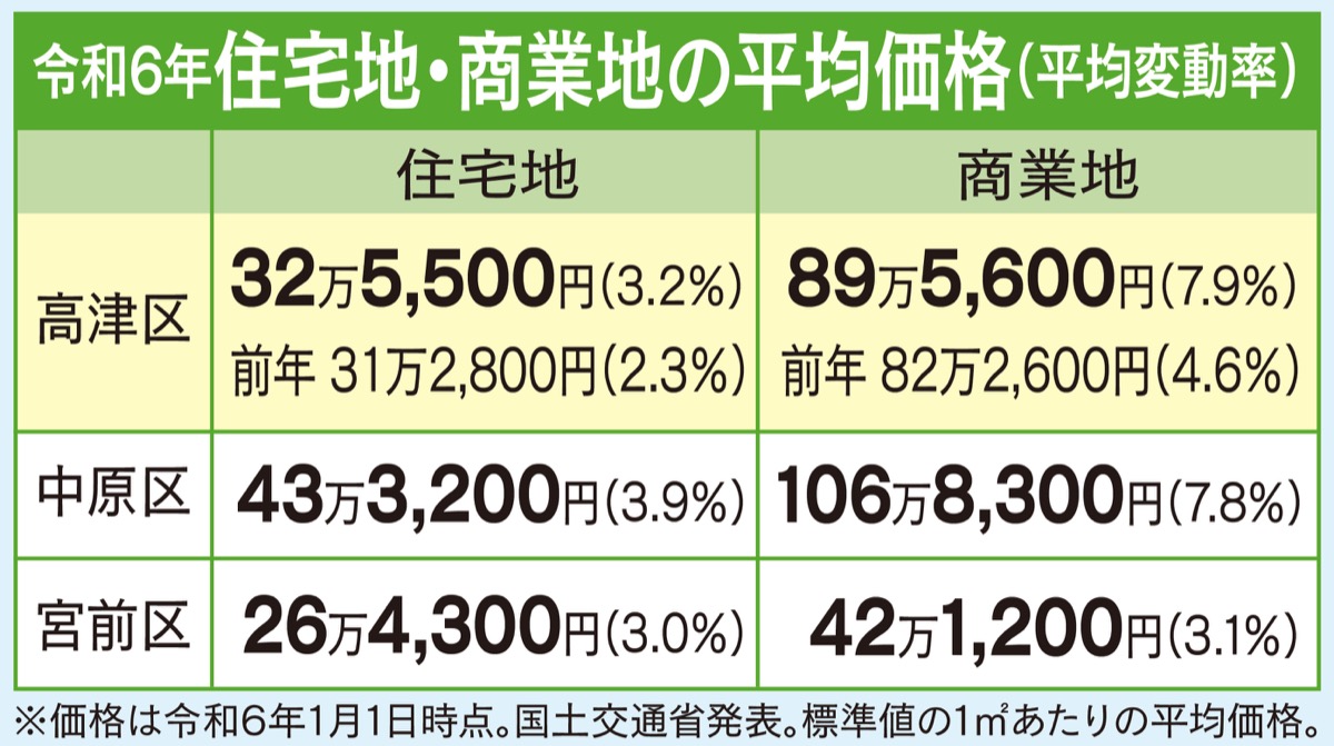 国交省が昨年3月に公表した令和6年の公示地価では、都心に近い川崎市の住宅地は全ての区で上昇し、価格変動率は3・2%と上昇率が拡大。高津区も3・2%増で、前年比0・9ポイント上昇。交通利便性が高い住宅地を中心に需要が堅調で、駅周辺の価格上昇の波及や住環境の需要の多様化等により、前年横ばいだった地点でも上昇。商業地の変動率も7・9%で大幅に上昇。