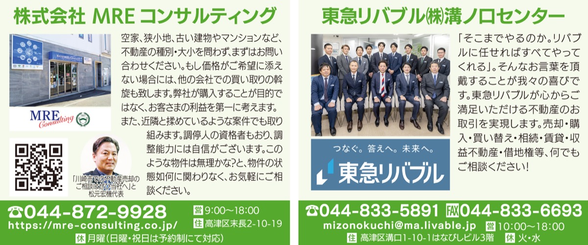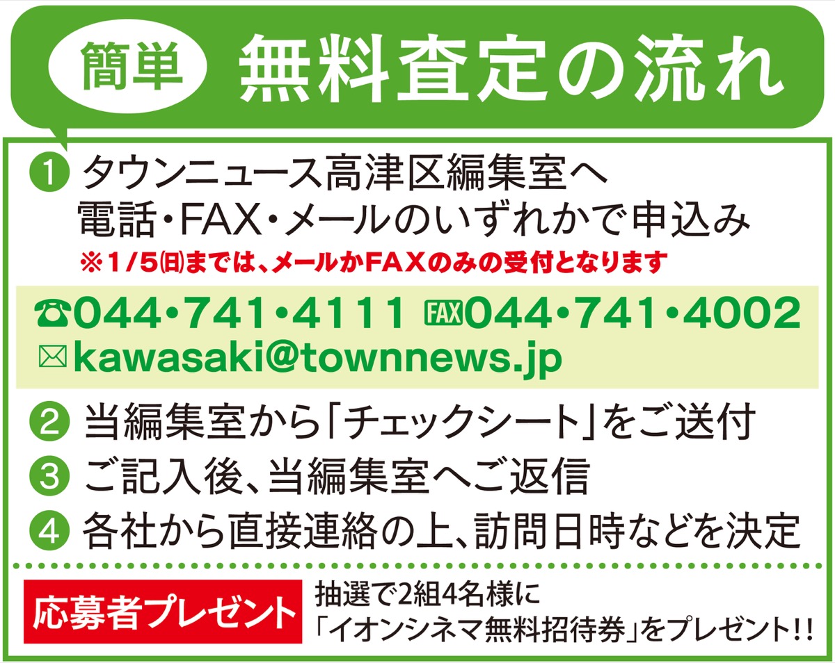 将来に備え、自宅の価値や評価は家族と共有しておきたいもの。本紙では新春特別企画として、不動産大手の2社(東急リバブル溝ノ口センター、MREコンサルティング)と協力し不動産を無料査定。本紙が取り次ぎ複数社一括で依頼することで、自宅の資産価値を比較でき、各社の視点を踏まえ今後の住まいや不動産全般の相談も可。まずは当編集室へお問合せを!