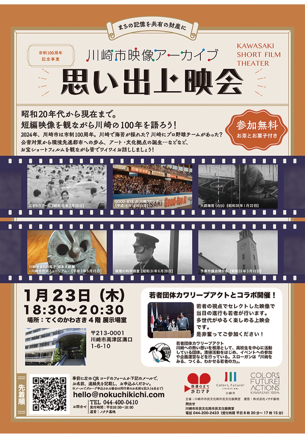 昭和20年代〜現在のお宝ショートムービーを観て、川崎市の100年を辿る「川崎市映像アーカイブ 思い出上映会」が1月23日(木)に開催される。場所は「てくのかわさき」(溝の口駅徒歩5分)4階の展示場室で午後6時30分から8時30分。
