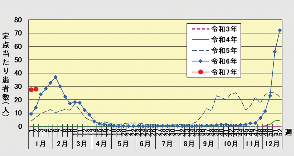 インフルエンザが川崎市内でも猛威を振るっている。2024年の12月16日から22日の集計期間に「流行発生警報基準値」を超えたため、市は12月24日にインフルエンザ流行発生警報を発令した。警報基準値を超えたのは24年2月以来。