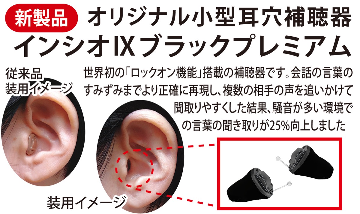 そんな同店が今、推奨しているのがオリジナル小型耳穴補聴器「インシオⅨブラックプレミアム」=写真左=。一見、気付かれないサイズ感と自然な付け心地を両立した高性能タイプで、言葉を余さず取り込む事で聞こえの明瞭化を実現する新機能を搭載しているのも人気の秘訣。認定補聴器技能者の資格を持つ三浦咲乃店長は「最新の高性能機種で会話をより楽しんで頂ければ。まずはお気軽に予約の上、ご来店下さい」と呼び掛けている。