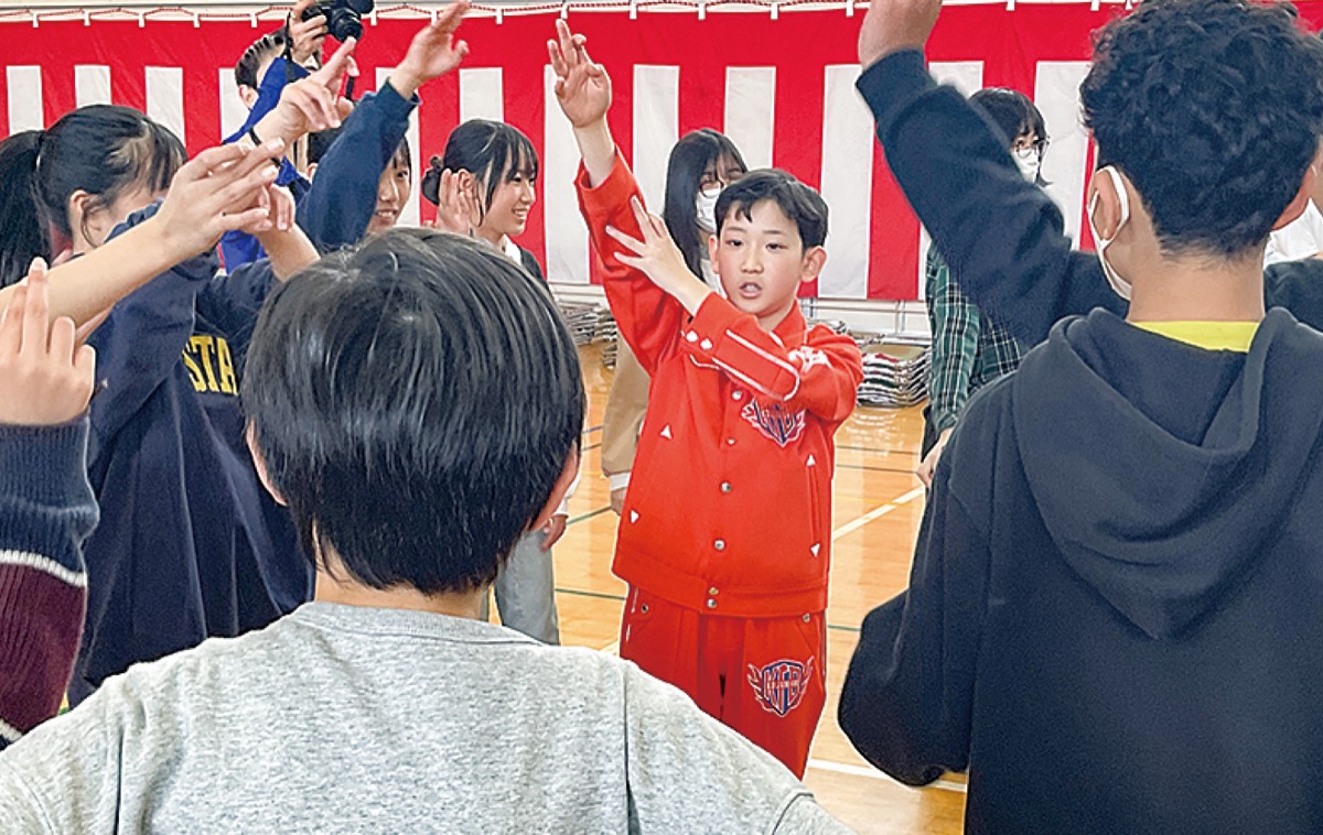 14日に行われたお披露目会は、大戸小学校の児童の前でこれらの動画を公開。また同チーム(ジュニアユース)所属しながら大戸小に通う6年生の瀬戸口泰佑さんが講師となり同級生に踊り方をレクチャーしたり、メンバーと児童が一緒に踊る場面もあり、楽しいプログラムに盛り上がりをみせていた。