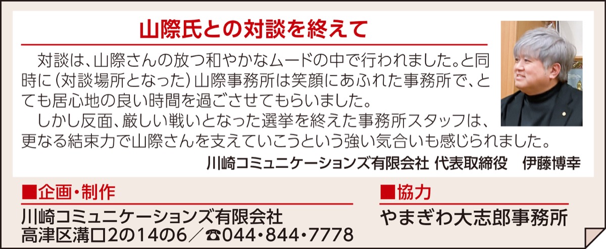 山際 これまで、地元川崎市⾼津区、中原区の皆様と共に歩んできた20数年を大切にして、事務所のスタッフ全員が⼀丸となり、地域とともに進んで参ります。そして、私⾃⾝は⼀貫して経済の分野で活動をして来ましたので、これからも⽇本全体が豊かに元気になるよう全⼒で働いてまいります。