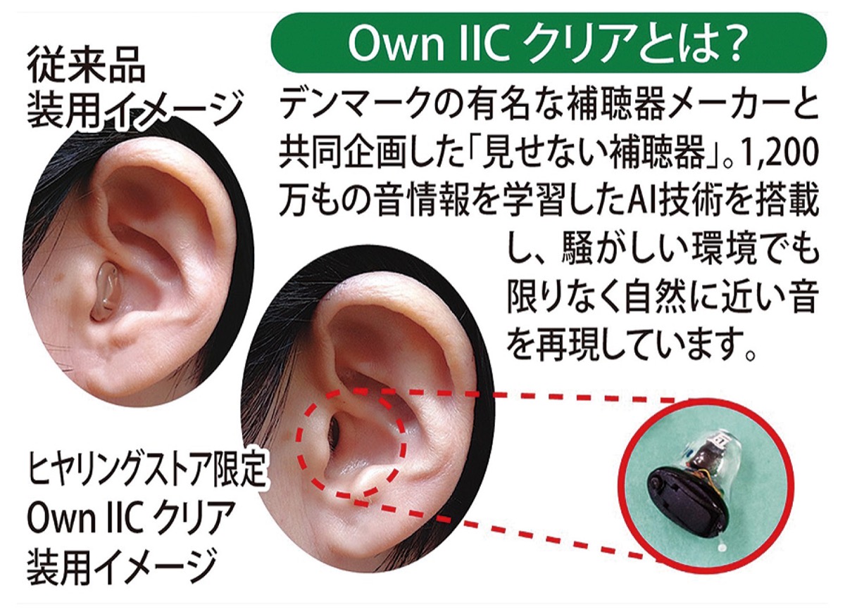そんな同店が今、推奨しているのがデンマークの補聴器メーカー「オーティコン」と共同で企画したオリジナルの見せない補聴器「オウンIICクリア」=写真左=。周りの雑音に気をとられることなく会話が楽しめ、限りなく自然に近い音を再現してくれる先進のAI技術を搭載しているのも人気の秘訣。認定補聴器技能者の資格を持つ三浦咲乃店長は「最新の高性能機種で会話をより楽しんで頂ければ。タウンニュースを見た方はオーダー貸出無料ですのでぜひ予約の上、ご来店下さい」と呼び掛けている。