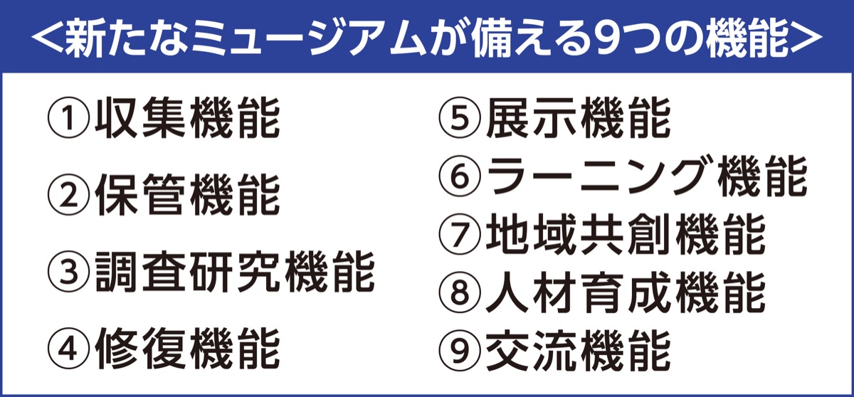 市民に広く伝えるべき”モノ”の選定と収集を行う「収集」などミュージアムの基盤となる機能を定めたほか、収蔵品や調査研究の成果などの活用を進めていく「展示」「ラーニング」「地域共創」、”ヒト”を通じて、ミュージアムの活動の幅を広げ、さまざまなつながりを創出する機能として「人材育成」「交流」も明記している。