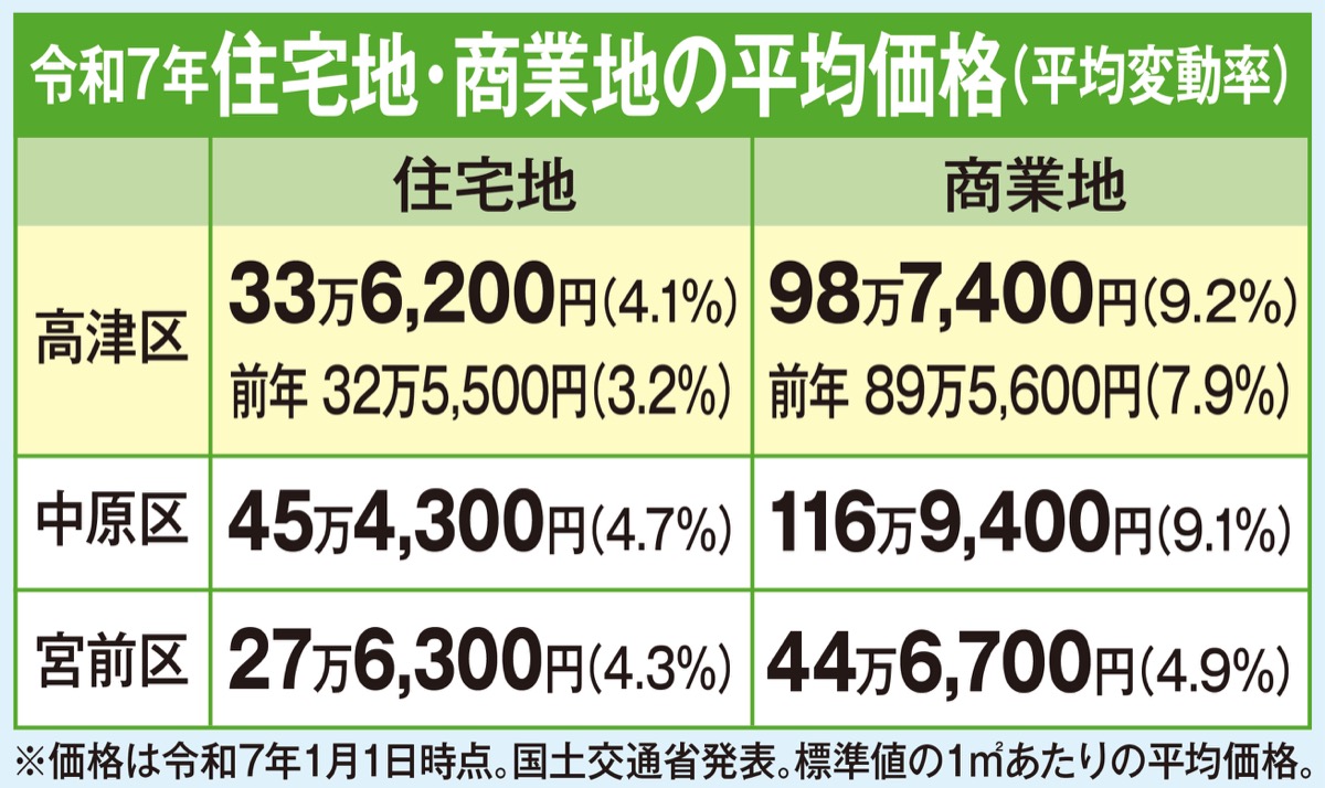 国交省が今年3月に公表した令和7年の公示地価で、川崎市は全ての区で上昇し、平均変動率は4・4%と上昇率が拡大。高津区は4・1%で、交通利便性の高い住宅地を中心に需要が堅調で、起伏のある地勢やバス圏でも地価上昇が見られた。商業地の変動率も9・2%で大幅に上昇。