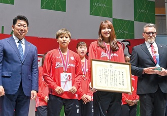 今回の2連覇、2冠を祝し、川崎市からスポーツ特別賞が贈られた。テーブスヘッドコーチは「大変光栄。チームの目標だった皇后杯優勝、リーグ連覇を達成し、特別なシーズンだった。多くの困難な時期もあったが選手たちが粘り強く戦い抜いた。引き続き応援を」と呼び掛けた。キャプテンの宮澤夕貴選手は優勝が決まった瞬間を振り返り、「シーズン中、苦しいときもあったが、スタッフも含めたこのチームで優勝できてうれしかった」と声を弾ませた。地域やファンへ「今までやってきてこういう結果を出せたのは、支えてくださるファンの方々や川崎市民のおかげ。恩返ししていきたい」と感謝の言葉を述べた。