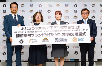 4月20日にUとどろきスタジアムで行われた記者会見には、佐藤理事長、陸前高田市の佐々木拓市長、フロンターレの吉田明宏社長も同席。佐々木市長は「素晴らしい企画に参加でき、感謝している」と話し、吉田社長は「自ら行動を起こし、広い視点を持った情熱に感銘を受けた。今後の活躍に期待したい」と斎藤さんへエールを送った。佐藤理事長は「こども食堂は運用資金の調達に苦慮している。斎藤さんの思い、行動に感謝している」と話した。
