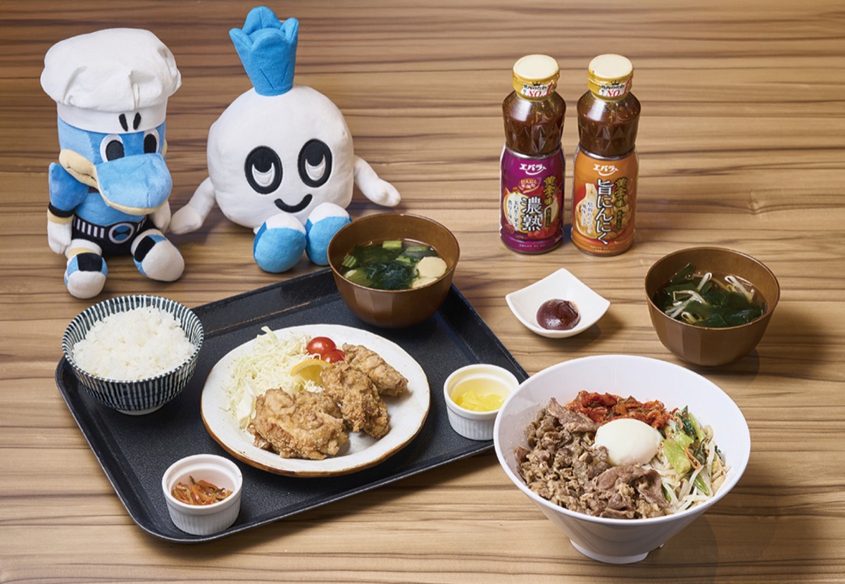 通常の揚げ物に比べて脂質とカロリーが控えめな「ノンフライ米粉からあげ」(1200円)には、ガーリックオイルの風味とコクをバランスよく組み合わせた中辛の焼肉のたれ「黄金の味 旨にんにく 360g」を使用。ごはん(炭水化物)や野菜(ビタミン・ミネラル)など、多様な食材が組み合わさった「ビビンバ丼」(1200円)は、「黄金の味 濃熟 360g」で炒め玉ねぎや干しぶどう、完熟トマトをきかせた濃厚な味わいに仕上げた。