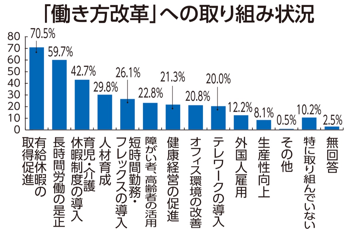 また「働き方改革」の取り組みは、「有給休暇の取得促進」(70・5%)や「長時間労働の是正」(59・7%)を多くの企業が進めているほか、「短時間勤務・フレックスの導入」(26・1%)や「テレワークの導入」(20%)など、多様な働き方を取り入れる企業も一定数確認された。