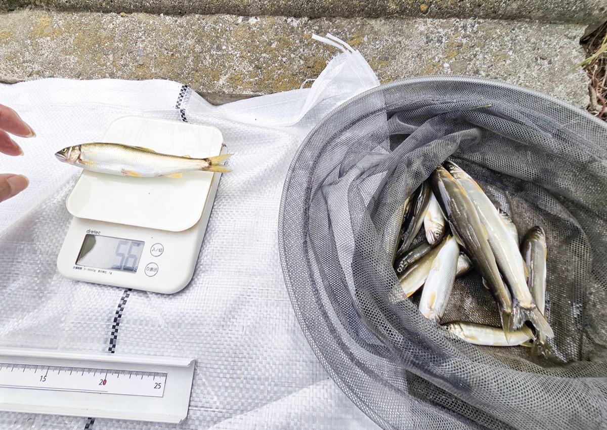この試し釣りは、多摩川におけるアユの遡上数や成長具合の調査を目的としたもの。当日は高津地区の組合員5人が、東名高速道路下から新二子橋までの計4地点で約3時間にわたって竿をふるった。今回の釣果は5人での合計35匹。サイズは平均14センチ程度で、最大は18センチ、52グラムだった。