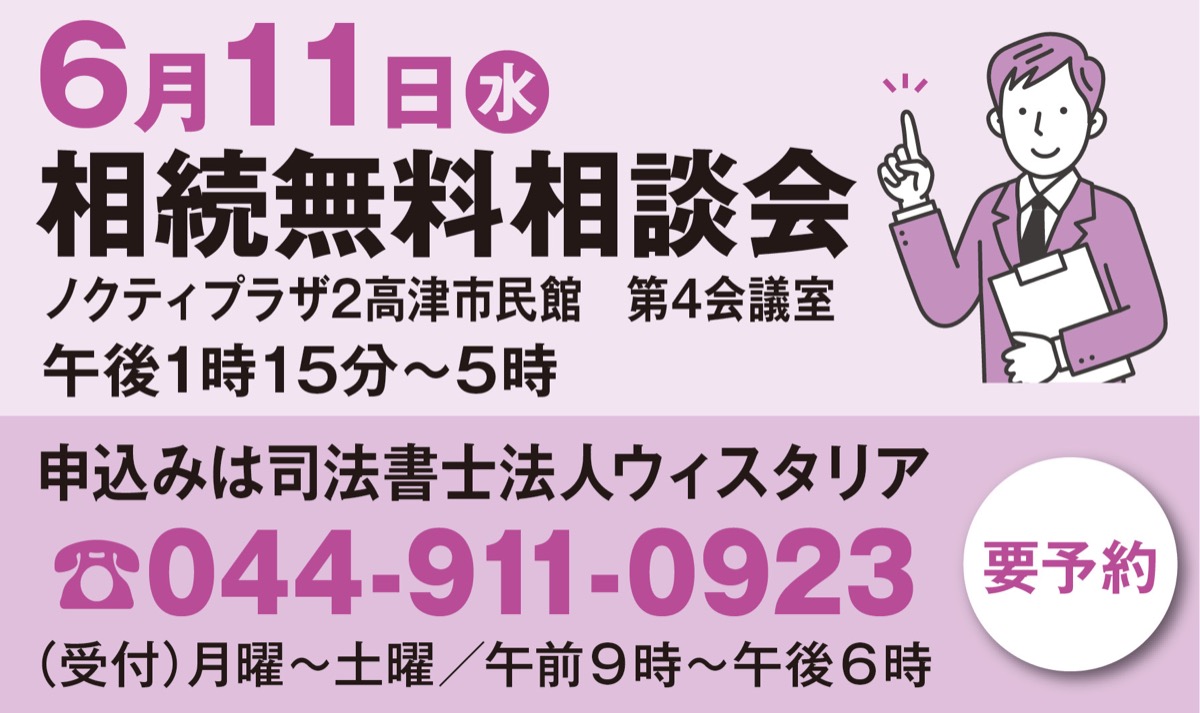 地元に密着し活動する司法書士法人ウィスタリアは6月11日(水)、ノクティプラザ2(11階)高津市民館第4会議室で相続に関する無料相談会を開催する。午後1時15分から5時。事前予約制。
