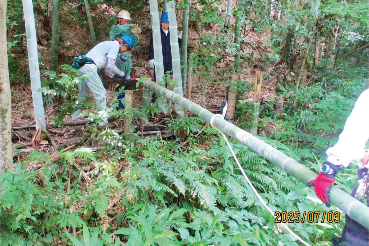 それでも私たちの活動は活発です。7月3日活動日には暑さの中、会員22名に加えて団体会員の大和生研さんからも4名の参加者を迎え、文字通り汗を流して頂きました。作業内容は春日台では親子ジャガイモ堀体験が終わった畑を耕し、次の親子大根抜き体験に向けて準備を始めました。ふれあいの森では7月末の炭焼きに向けて竹の切り出しです。