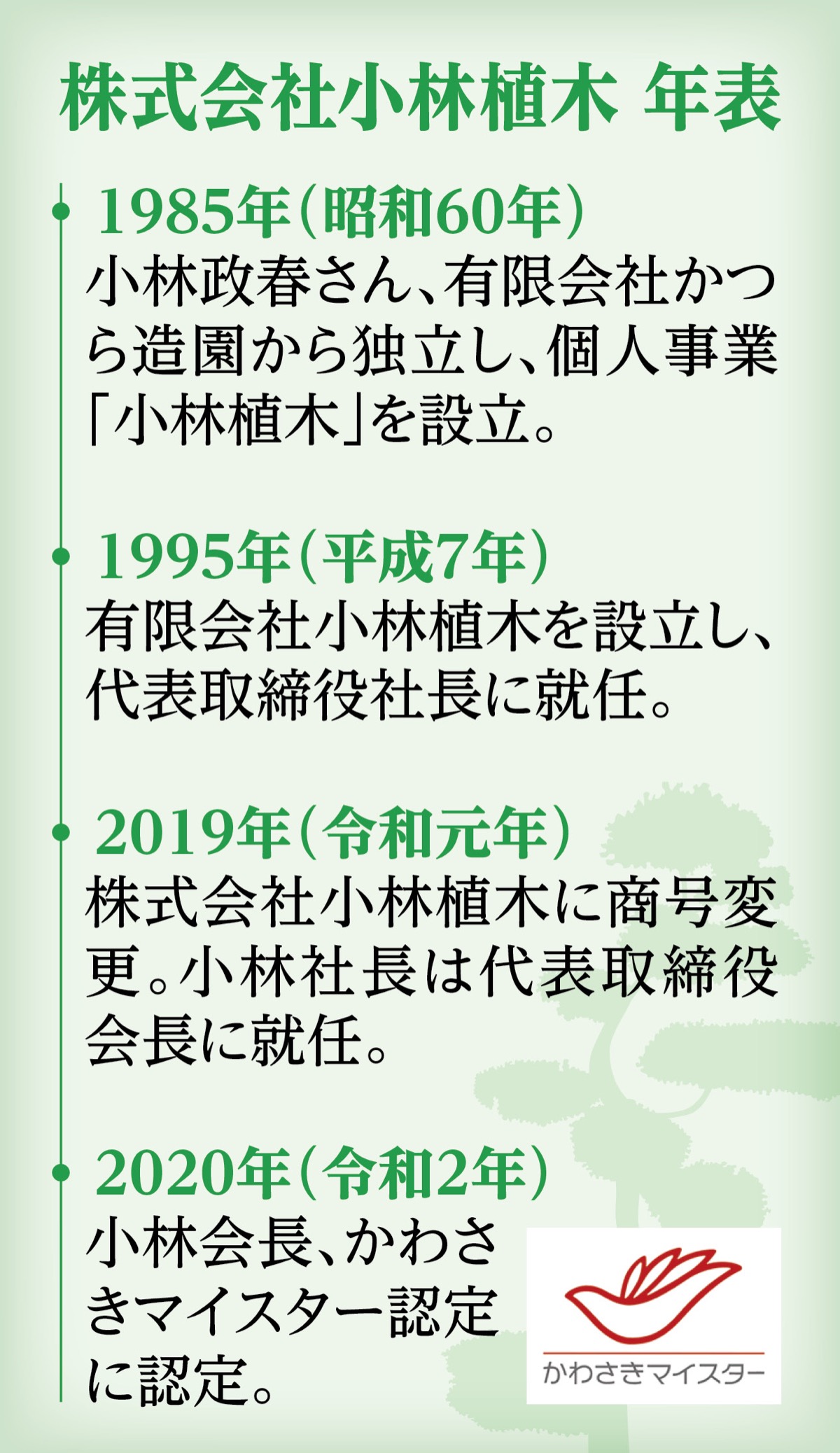 人々の暮らしに寄り添い、街の緑に息吹を吹き込んできた(株)小林植木(子母口)。今年7月に創業30周年を迎える同社の歩みや今後について、代表取締役会長の小林政春さんに伺った。