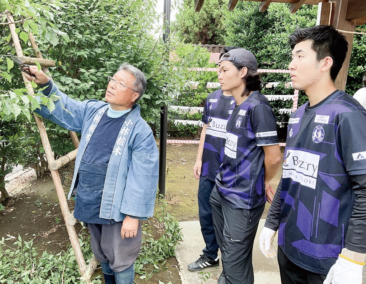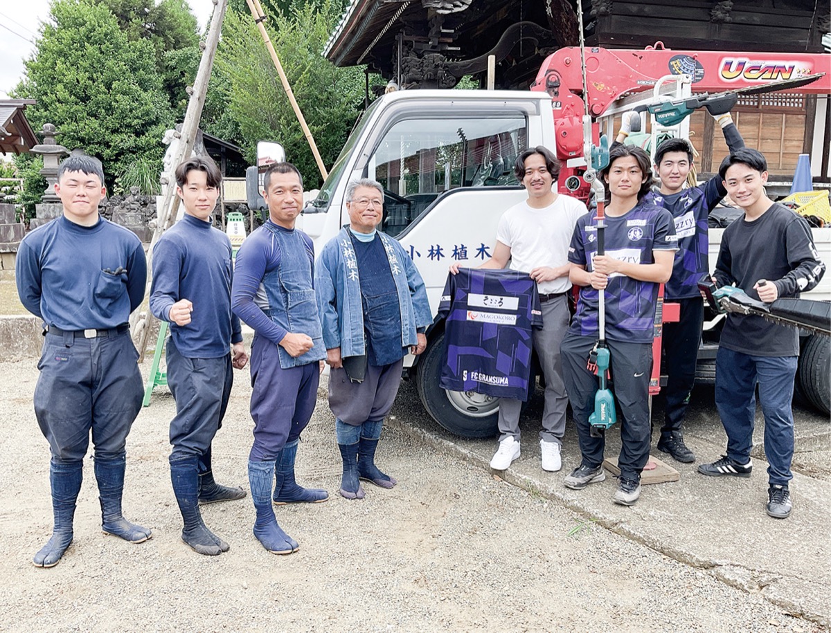 県の社会人サッカーリーグに所属する、メンバー全員が大学生のクラブ「FC GRANSUMA(横浜市)」の選手と(株)小林植木(小林政春会長・子母口)が7月12日、橘樹神社(子母口)の植栽の剪定作業を通して交流した。なぜ、学生選手たちは、普段接点のない地域の企業と協力することになったのか。その理由とは――。