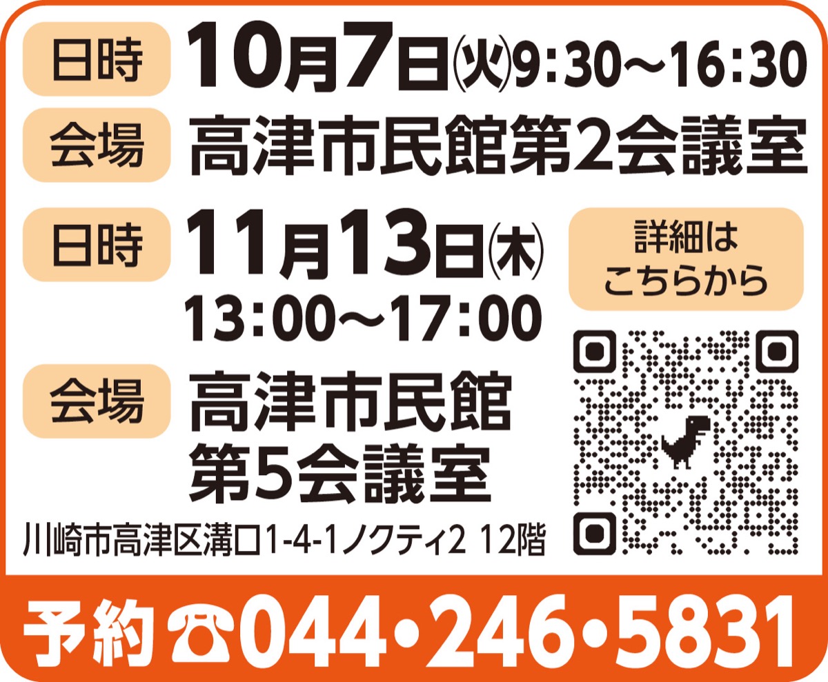 地元の税理士、司法書士、宅建士による「川崎市相続無料相談会」が10月7日(火)と11月13日(木)高津市民館で開催される。要予約。受付時間は下記の枠内参照。