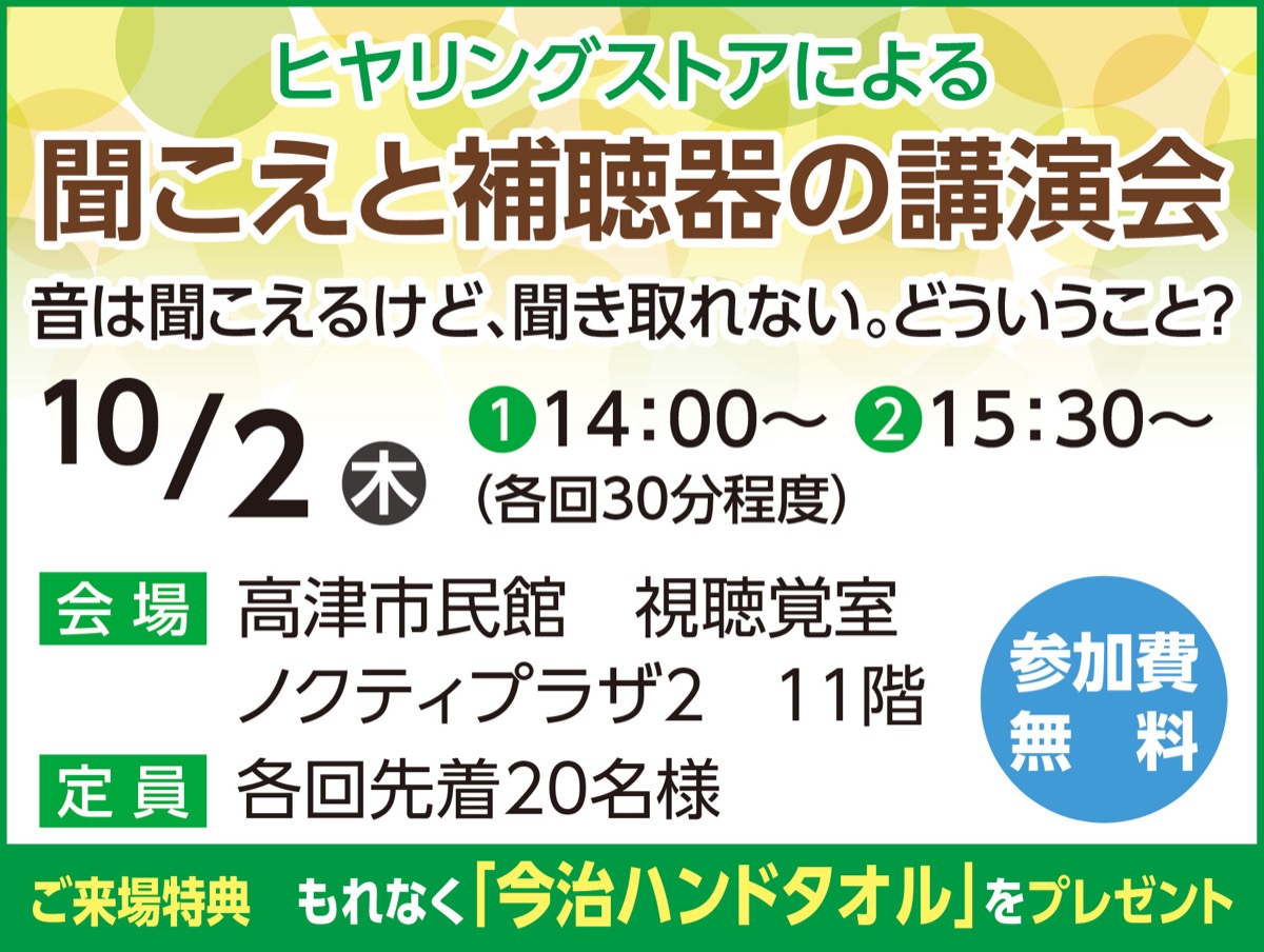 また「聞こえるけど聞き取れないのはなぜなのか?」「難聴と認知症との関連」などといった具体的な事柄にも言及する内容となっているもの特長のひとつ。三浦咲乃店長は「ご来場特典として、もれなく今治ハンドタオルを進呈致します。また希望があれば個々の聞こえに関する不安や悩みを解消する相談にも応じますのでぜひ気軽に問い合わせを」と話し広く参加を呼び掛けている。