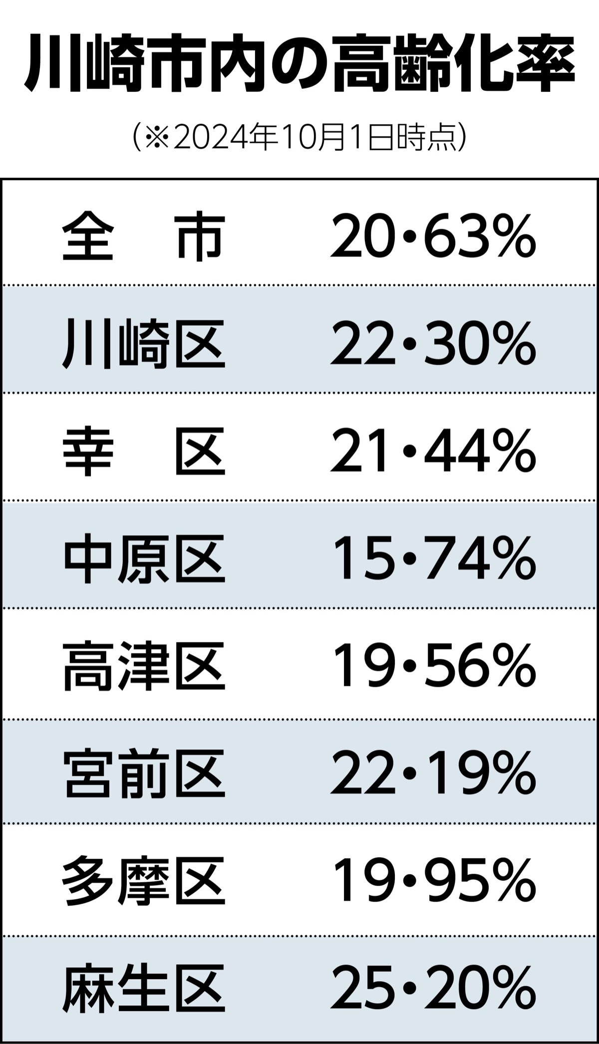 市が今年4月にまとめた「市高齢者施策状況」では、2024年10月1日時点の高齢者人口は32万117人で、総人口に占める高齢化率は全国平均(29・2%)より大幅に低い20・63%。高齢化率が高い地区は麻生区で25・20%、低い地区は中原区で15・74%だった。