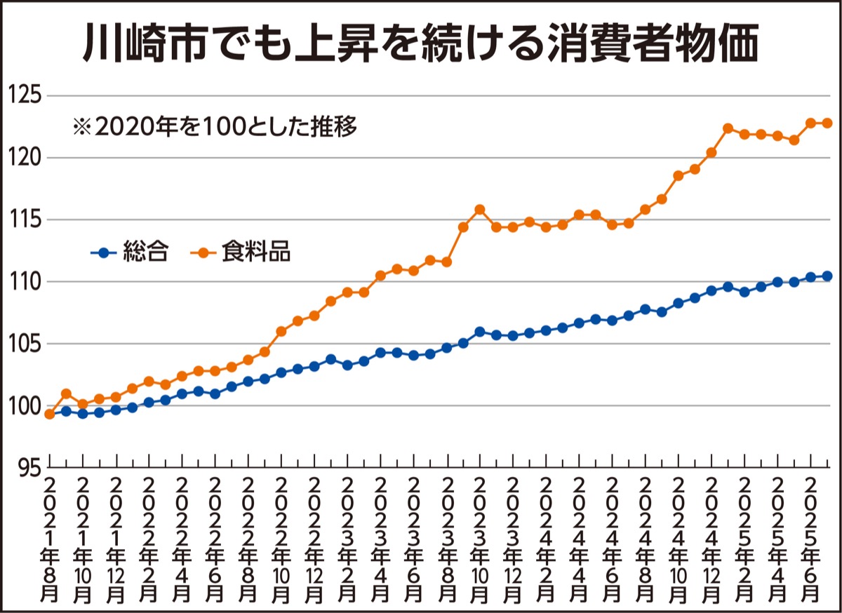 2022年初頭から始まった消費者物価の高騰は、いまだ留まることを知りません。下記のグラフは2020年を100とした物価指数の推移を示したもので、川崎市においても物価の上昇が右肩上がりに続いています。