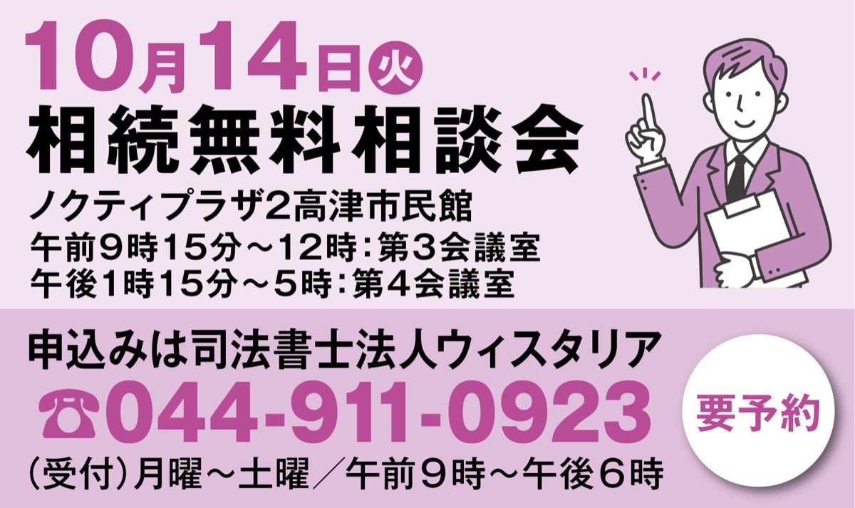 多摩区に事務所を構える司法書士法人ウィスタリアは10月14日(火)、高津市民館で相続に関する無料相談会を開催する。午前9時15分から12時は第3会議室、午後1時15分から5時は第4会議室、事前予約制。