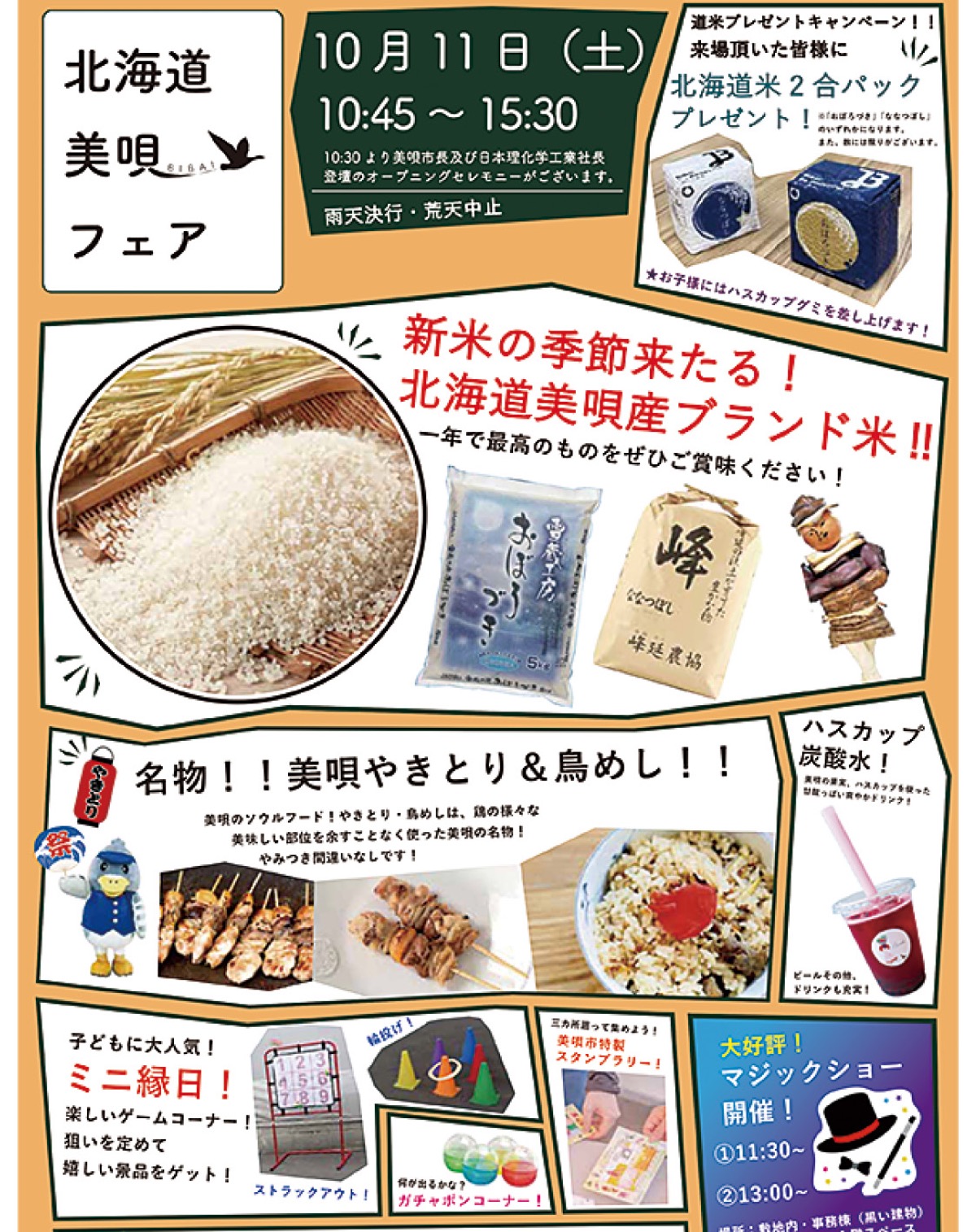 催し当日は、美唄の定番商品として名を馳せる「焼き鳥」や「鳥めし」、特産品のハスカップを使ったドリンクなどが販売される。また、マジックショーやミニ縁日(ゲームコーナー)、スタンプラリーなどといった、子ども達も楽しめるイベントが各種用意されるほか「豪華賞品が当たる!?大抽選会」(14時〜)も行われる予定となっている(いずれも雨天決行、荒天中止)。