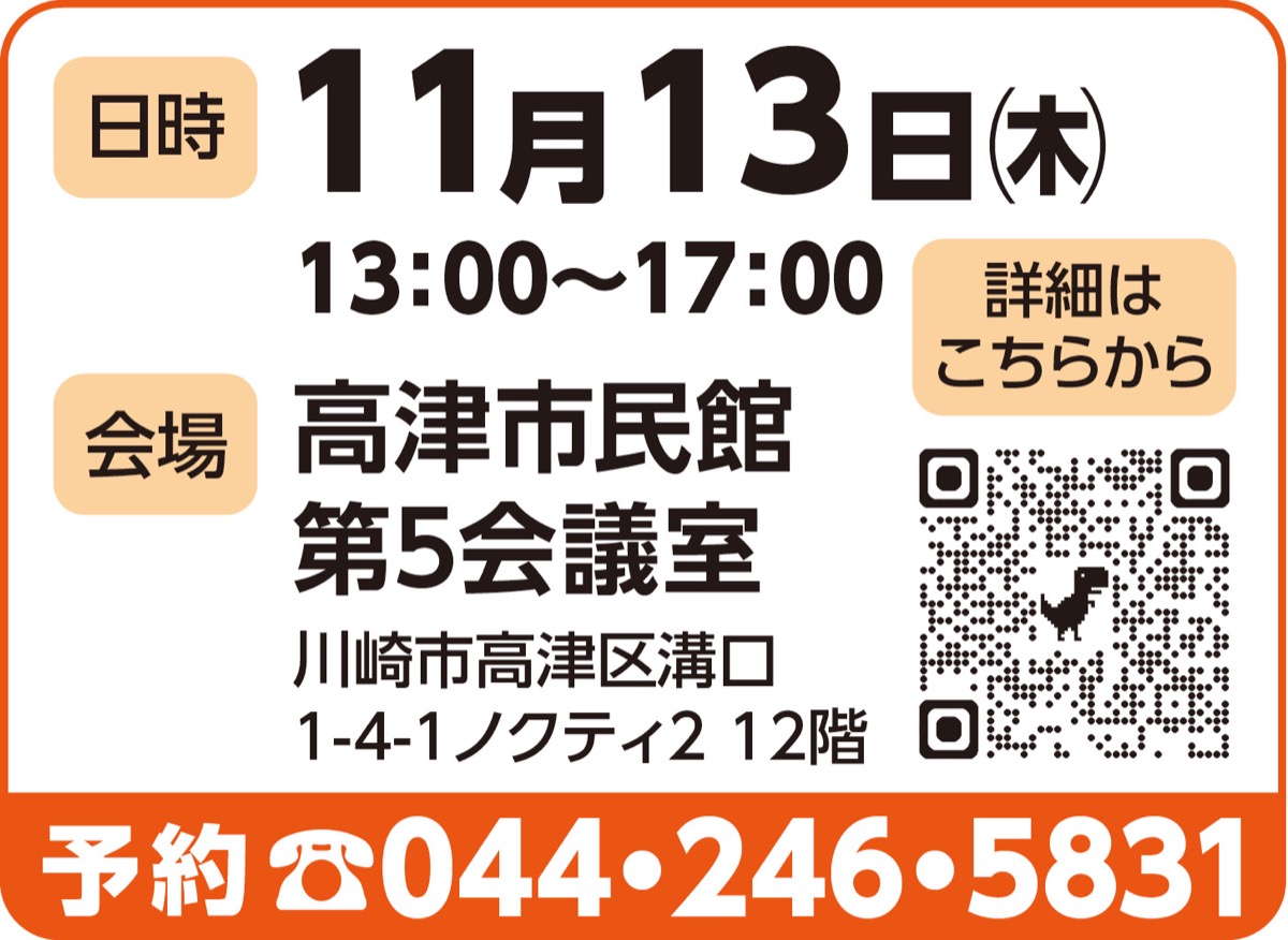 地元の税理士、司法書士、宅建士による「川崎市相続無料相談会」が11月13日(木)高津市民館で開催される。要予約。受付時間は下記の枠内参照。