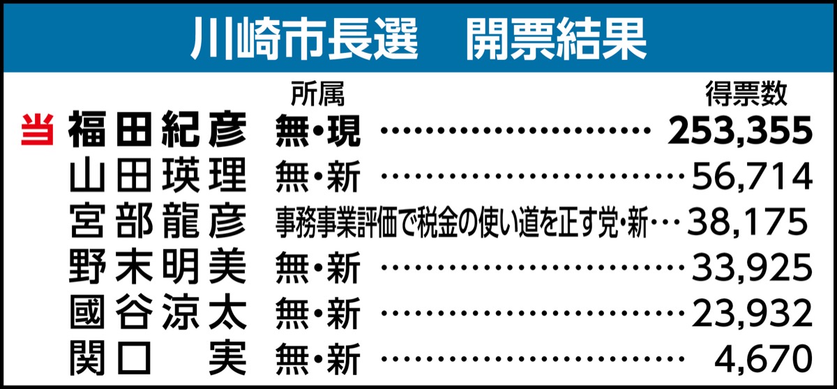 市長選には福田氏のほか、川崎市議を辞職して無所属で挑戦した山田瑛理氏(42)、出版社CEOで事務事業評価で税金の使い道を正す党から出馬した宮部龍彦氏(46)、社会福祉法人理事で共産党が推薦した野末明美氏(60)、無所属で会社員の國谷涼太氏(25)、無所属で清掃員の関口実氏(67)の5氏が立候補し、街頭演説などでそれぞれの政策を訴えたが及ばなかった。