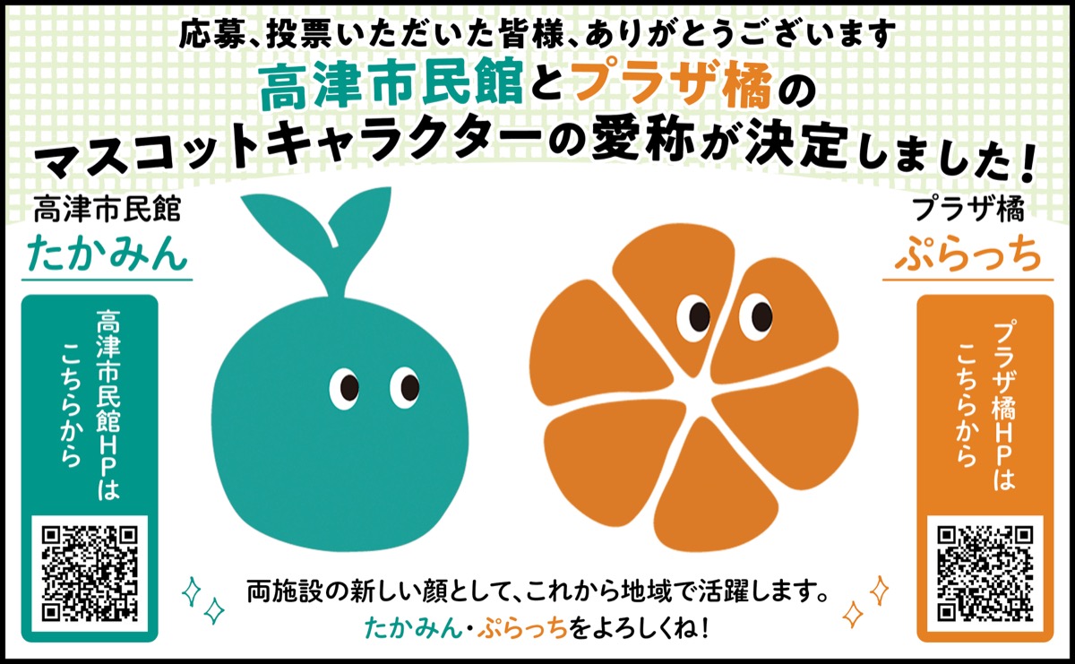市民館の担当者は「たくさんの応募と投票をいただき、感謝しています。たかみんとぷらっちに親しんでもらい、多くの人が2つの施設に遊びに来てもらえれば」と語った。今後は、両施設の広報やイベントで活躍し、地域の人々と施設をつなぐ役割を担う予定となっている。