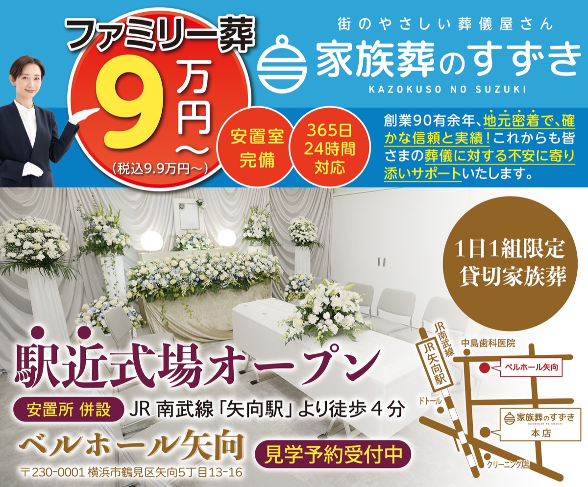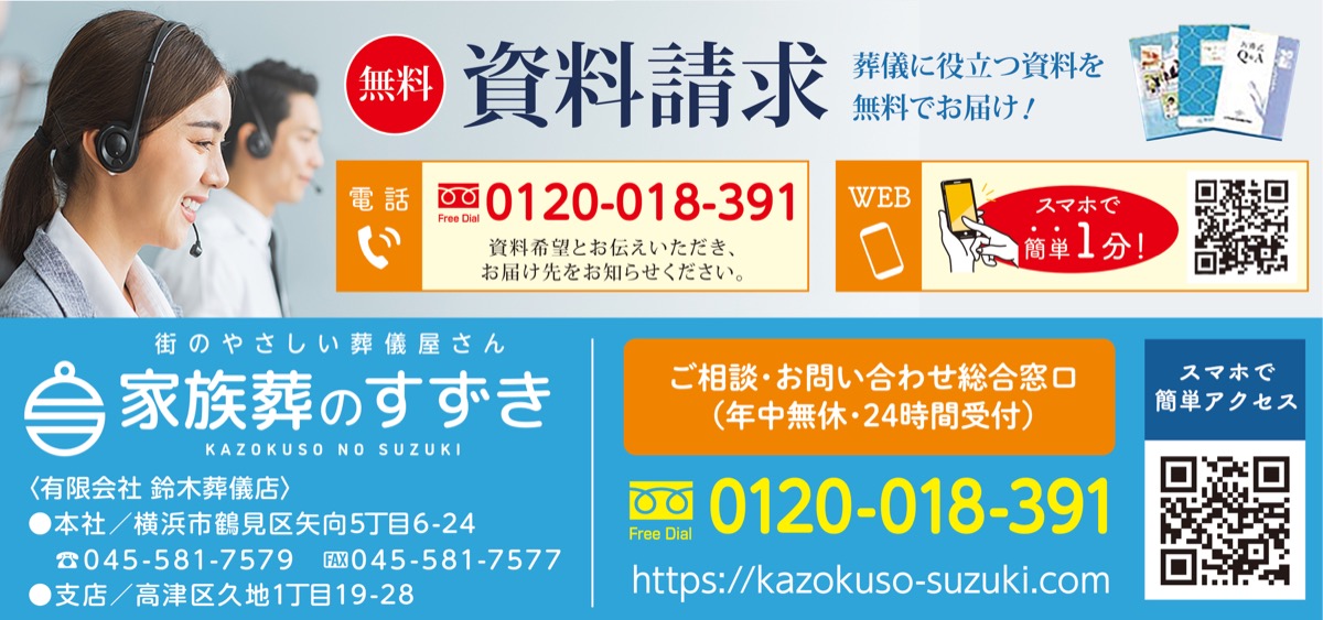 今回、コラムを寄稿してくれた終活カウンセラーの鈴木まみ氏は、久地に支店を構え地域密着を掲げる「家族葬のすずき」の本店(横浜市)において、終活や葬儀についての相談に無料で応じている(要・事前申込み)。詳細問合せ、申込みは左記へ。