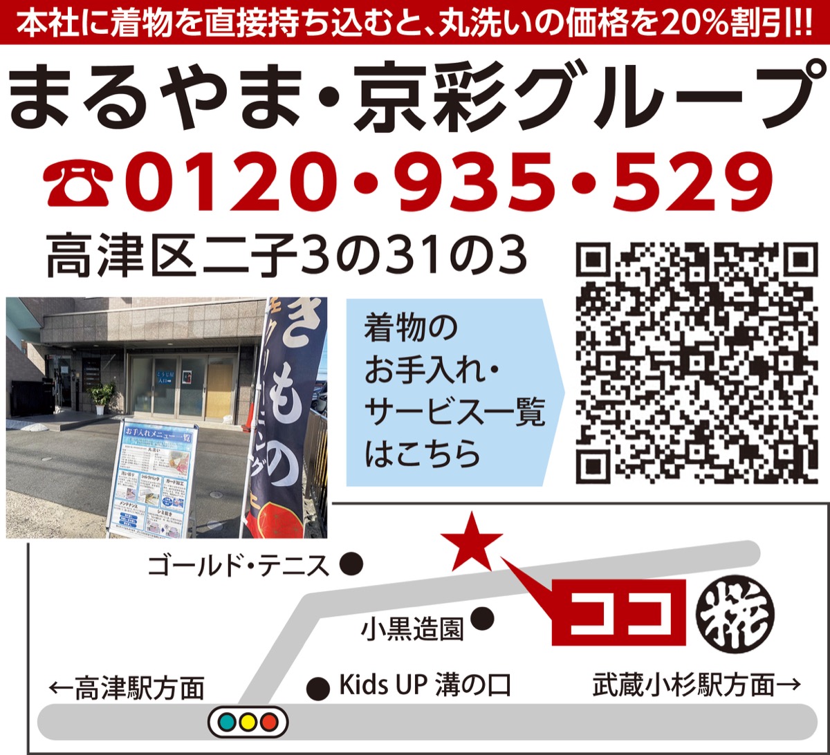 この取り組みは、同グループの本社(二子3の31の3)に着物などの和装を直接持ち込むと、汚れを手作業で落とす「丸洗い」の価格(3850円〜)が20%割引されるというもの。
