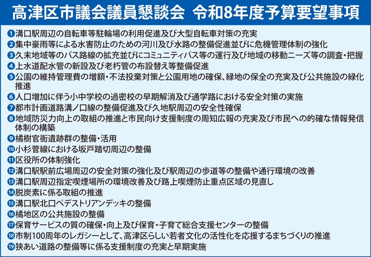 川崎市の来年度予算編成に際し、地元選出の市議会議員団で構成される「高津区市議会議員懇談会」が11月21日に予算要望書を福田紀彦市長に提出した。