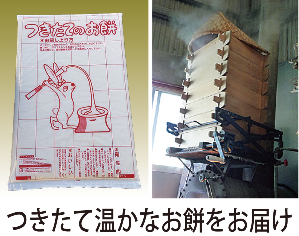 最高級新潟こがねもちをメインとした自家精米のもち米を100%使用、ボイラーの蒸気で一気に蒸かしあげ、コシが強いと定評がある。焼いてもダレないので「お雑煮に最適」と評判の逸品。「美味しいお餅は食べたいけれど量が多い」という人にはハーフサイズ(2500円/1・4kg)がお勧め。一つひとつ手作りの鏡餅は大小様々のサイズで注文受付中。予約は12月19日(金)で一旦締め切る。