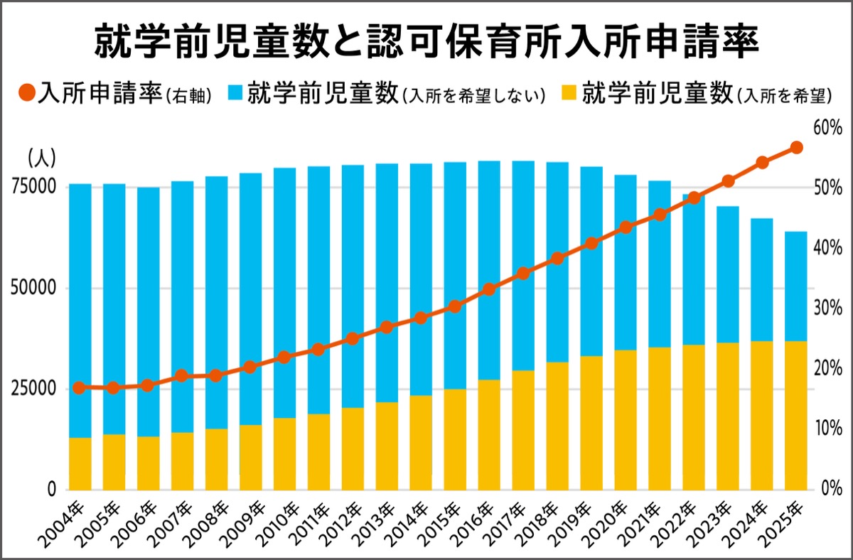 下記のグラフは、就学前児童数の推移と、認可保育所に入所を希望する児童の割合を示したものです。この間、就学前児童数が減る以上に申請率が上昇したため、結果的に入所を希望する児童数も増え続けていました。しかし、今年、はじめて入所希望児童数も減少に転じており、本市の保育施策は転換期を迎えているといえます。