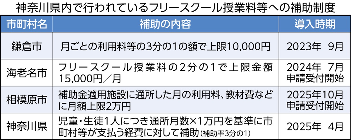 独自に保護者を支援する自治体も増えている。鎌倉市は23年9月、フリースクールの授業料等の一部を補助する制度を導入した。