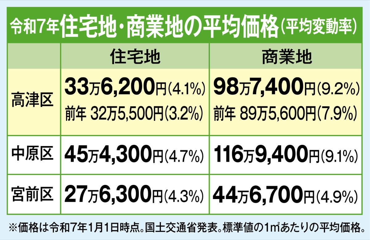 国交省が昨年3月に公表した令和7年の公示地価で、川崎市は全ての区で上昇し、平均変動率は4・4%と上昇率が拡大。高津区は4・1%で、交通利便性の高い住宅地を中心に需要が堅調で、起伏のある地勢やバス圏でも地価上昇が見られた。商業地の変動率も9・2%で大幅に上昇。