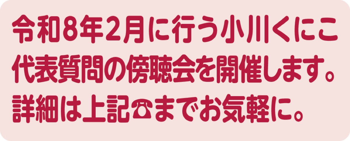 くにこ)議会最終日に本会議、関係常任委員会審議、本会議、という流れで、忙しかったですね。来年度予算概要、12月補正予算の説明を受け、調査、質問、本会議討論など様々なタスクがありましたので、目まぐるしい忙しさでした。この補正予算が県会で可決されたことを受け、すぐに施策実現していくために各関係課は詳細を決定していきますから、早期に総額500億円余の補正予算を認める必要があったんです。それに物価高騰対応ですから反対できませんしね。