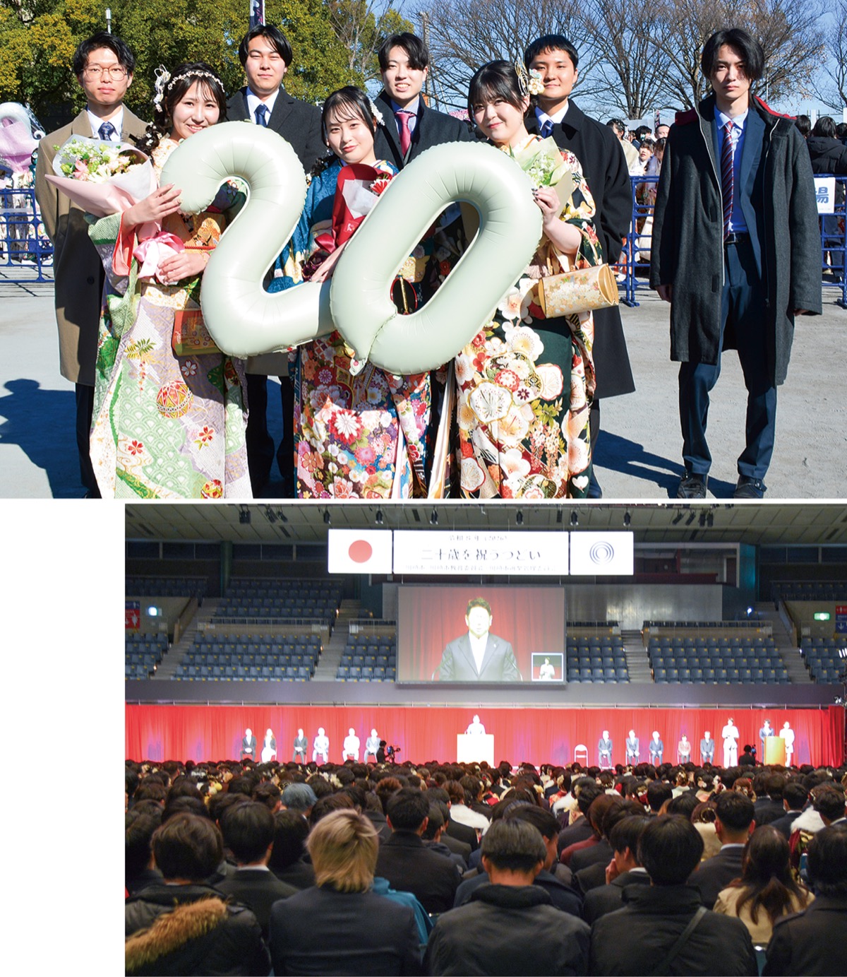 福田紀彦市長は、今年の新成人がコロナ禍に多感な青春時代を過ごしたことを念頭に置き、「ある科学者はアサガオの成長には太陽だけではなく、『暗さ』が必要だと証明した。コロナ禍は栄養を蓄える時間だったのかもしれない。これから色々なことに挑戦して、彩りのある人生を歩んでほしい」と激励した。