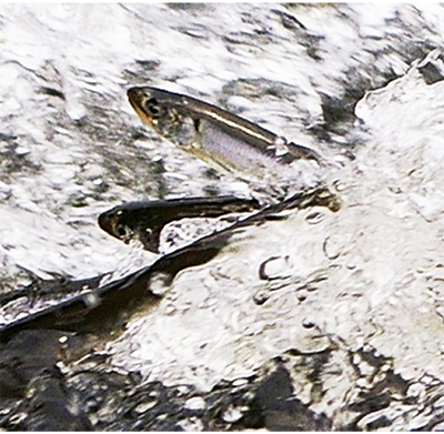 川崎河川漁業協同組合総代の山崎充哲さんによると、昨年よりは数は少ないものの、例年並みで、型は少し大きめという。区内の二ヶ領宿河原堰では魚道を上るアユの跳ねる様子が見られる=写真、4月28日に山崎さんが撮影。