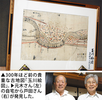 「玉川絵図」が見つかったのは宿河原で20代以上も続く旧家、元木茂さん(78)の自宅の納屋。宿河原町会の記念誌を作成しようと、編集に携わった戸田賢一郎さん(70)が12年前に発見した。