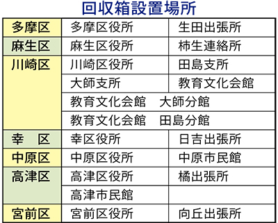 今年4月までの回収量は1840個に及ぶ。この実績を受け、幸区などから全市的な取り組みにしてはどうかと市に呼びかけがあった。これに応じる形で市では各区役所や支所、出張所など19ヵ所に回収箱を設置。これまでの回収実績を踏まえた年間の回収見込みを全市で2万8400個とし、全市での回収を開始した(区役所で年間2000個、その他の施設は年間1200個として算出)。
